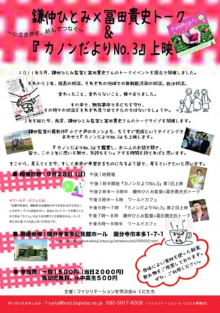 3年を経た今、再度、鎌仲ひとみ監督と冨田貴史さんのトークライブを開催します。鎌仲監督の最新作『小さき声のカノン』も、もうすぐ完成というタイミングで、あわせて『カノンだよりNo.3』も上映します。