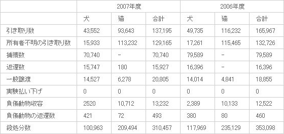 09年7月現在、最新の数字 2007年度の殺処分数 31万457頭 ※昨年度比で約4万頭の減少