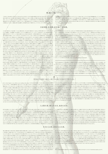 生命力あふれる野菜たちで生まれ変わったカラダからはいったいどんな精神や感性、発想、思考回路、創造性が生まれるんだろうか。そんな感度がビンビンなヒトたちが未来を描き、それを実現していったら、未来にはどんな地球が創造されるのだろうか…